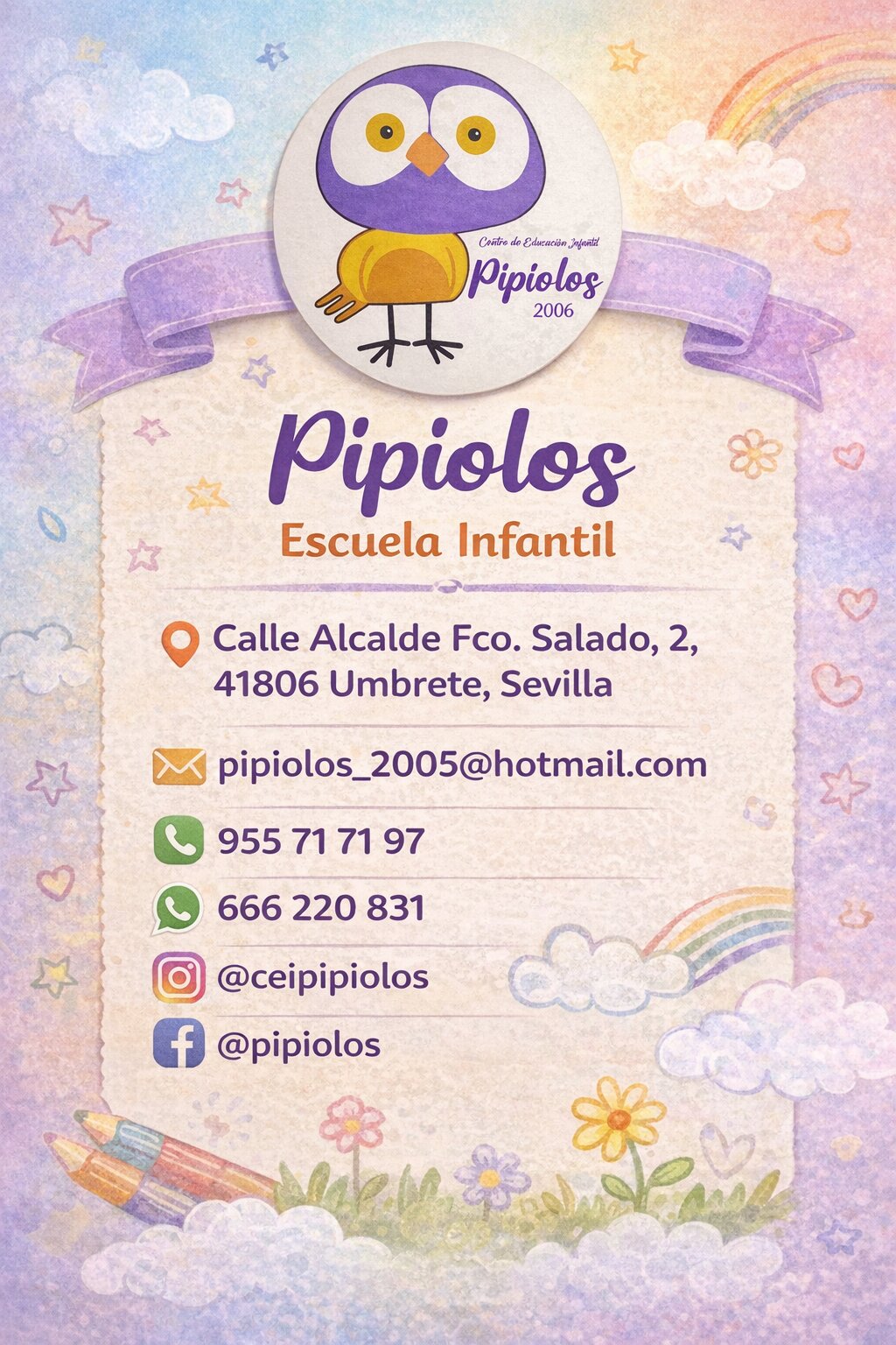 Centro de Educación Infantil Pipiolos es un espacio diseñado para que los más pequeños aprendan y se diviertan en un entorno seguro y familiar. Desde su nacimiento en 2006, se ha convertido en un referente en Umbrete, acogiendo a los niños con el mismo cariño y curiosidad que representa su imagen: el pequeño búho (mochuelo).