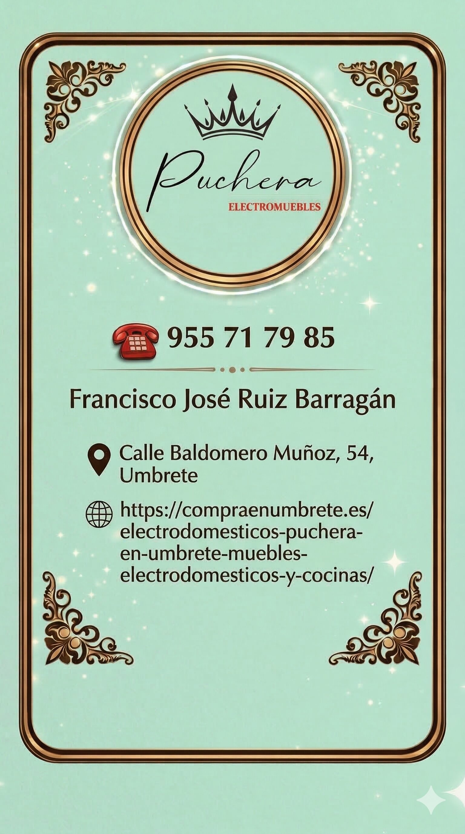 Electrodomésticos Puchera es una tienda de referencia en Umbrete especializada en electrodomésticos, muebles y equipamiento para el hogar. Con décadas de experiencia, ofrece una amplia variedad de productos para equipar la casa con calidad, asesoramiento personalizado y servicio cercano para los vecinos del Aljarafe.