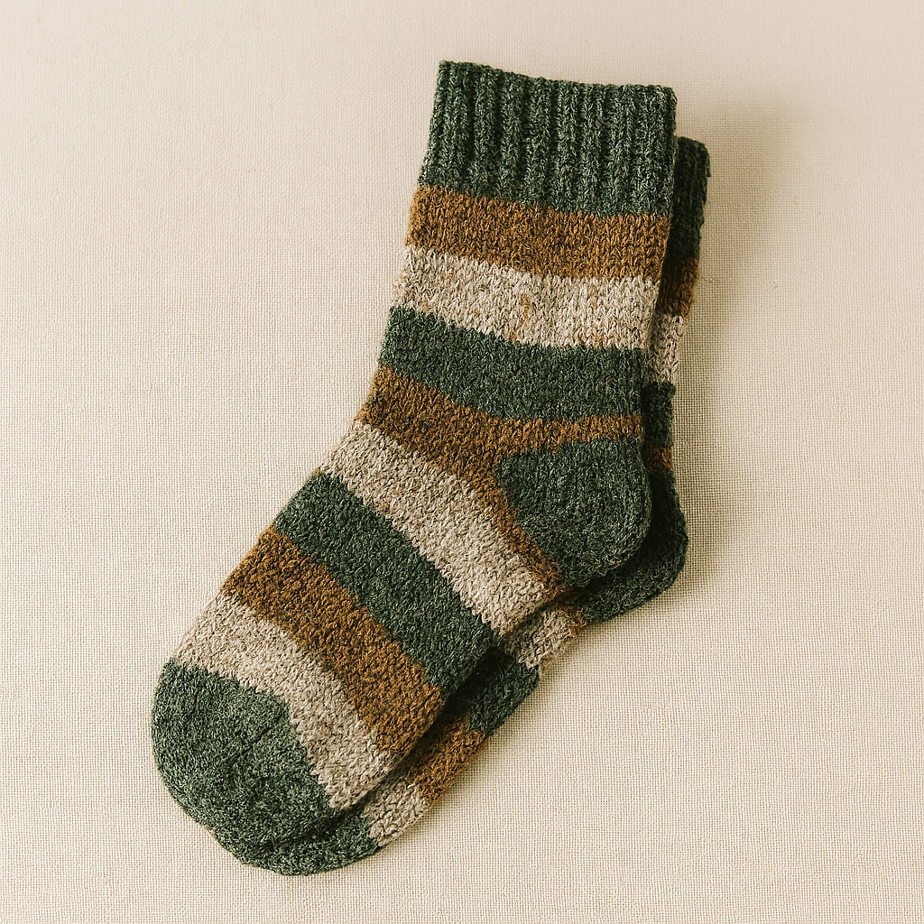 Calcetines sostenibles fabricados con lana reciclada, inspirados en la naturaleza y los colores del bosque. Una elección responsable y auténtica.